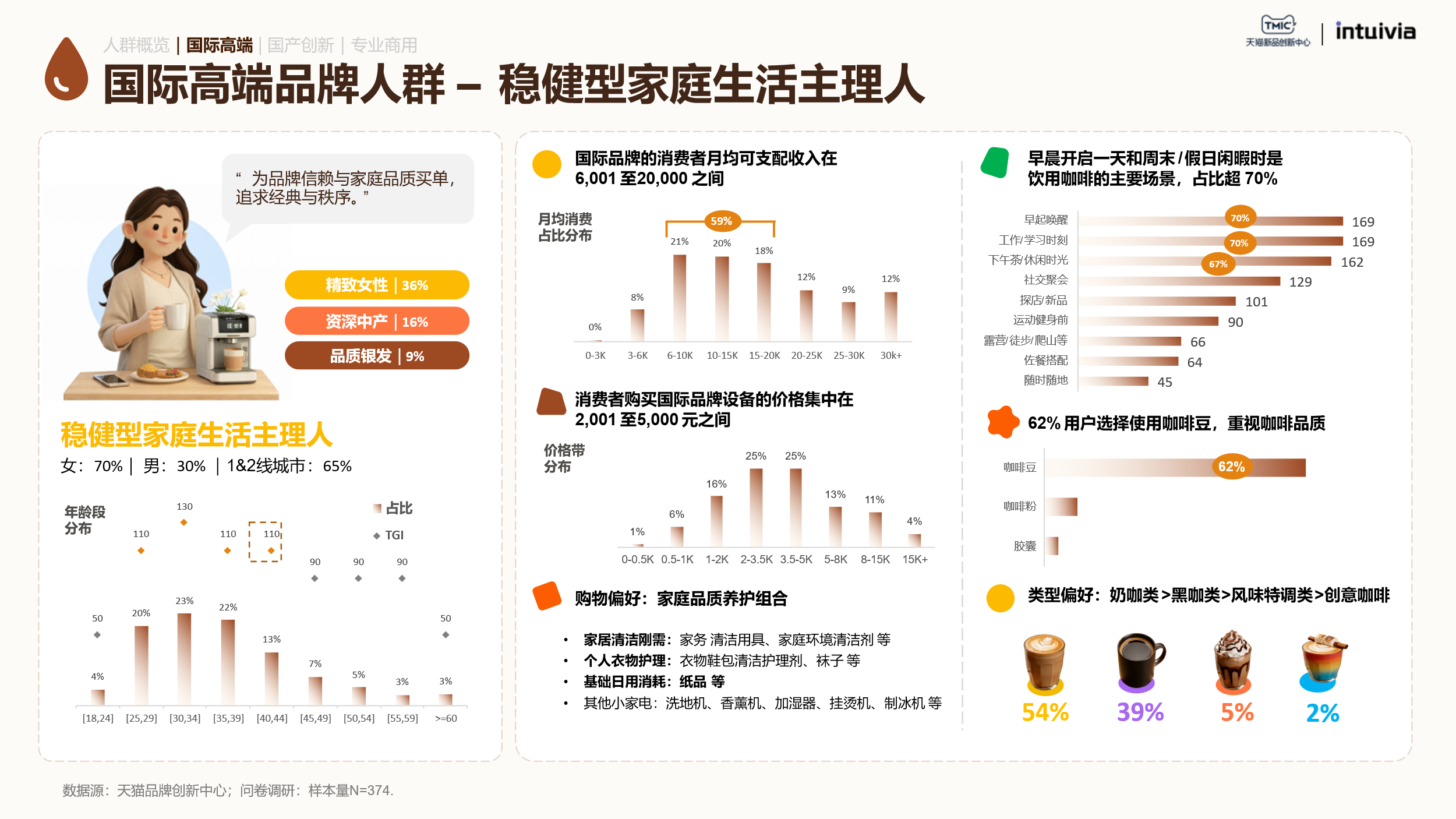 稳健型家庭生活主理人是国际高端品牌的核心用户群体。这个群体的决策逻辑非常清晰:品牌信赖优先于功能参数。她们追求的是家庭生活品质的提升与规律日常的仪式感,因此对制冰、萃茶、冰萃、饮水等创新功能尤为青睐。对她们来说,一台咖啡机不仅是厨房设备,更是家庭生活品质的象征。