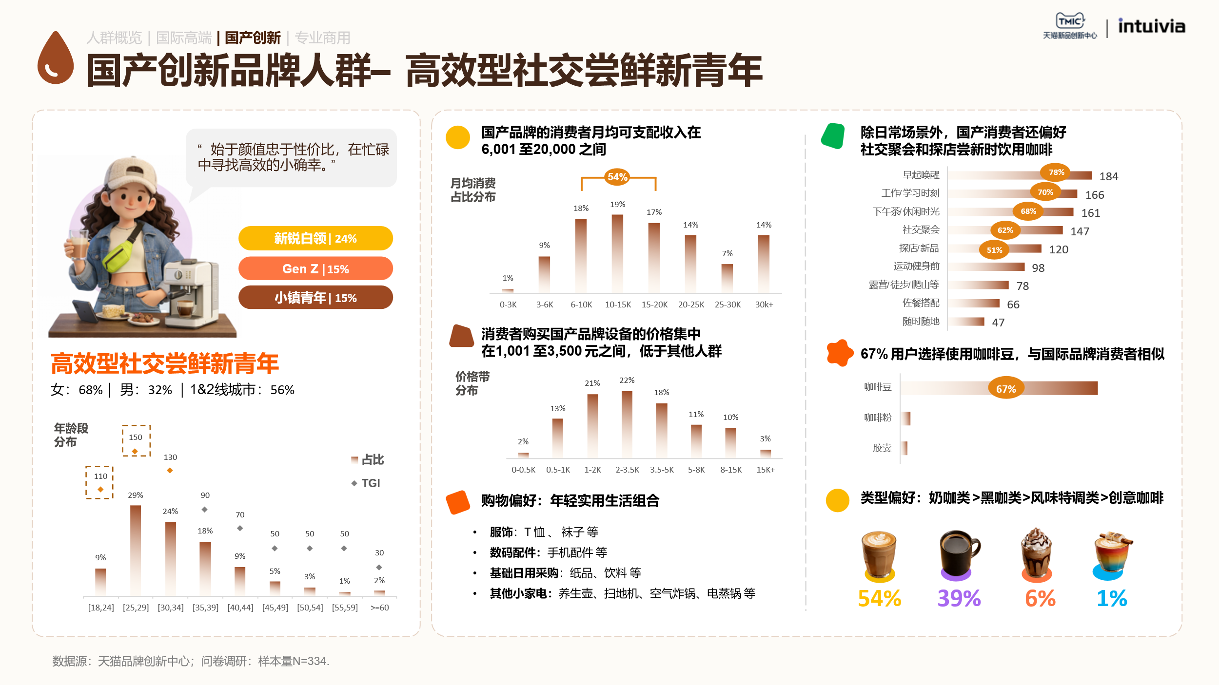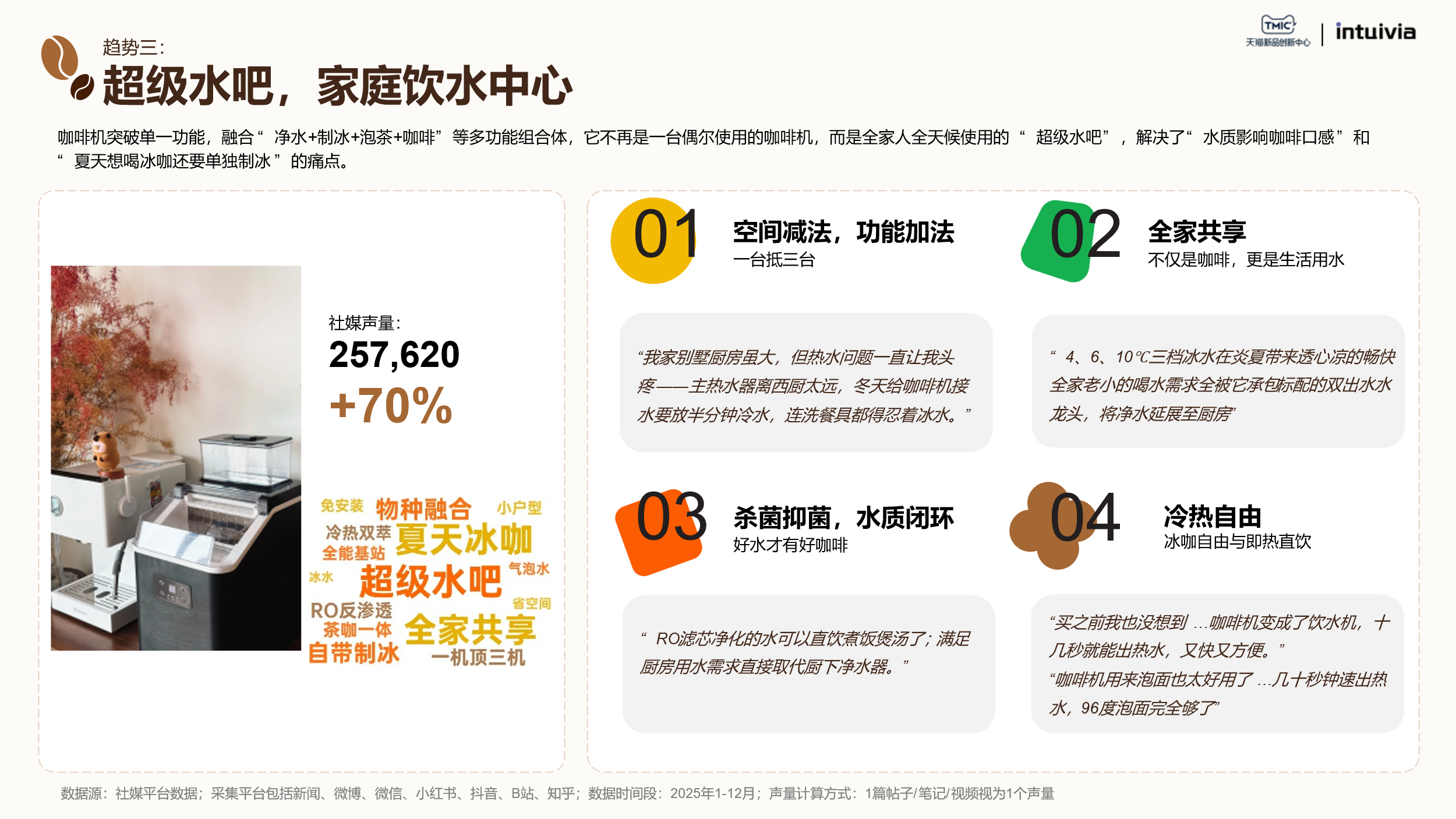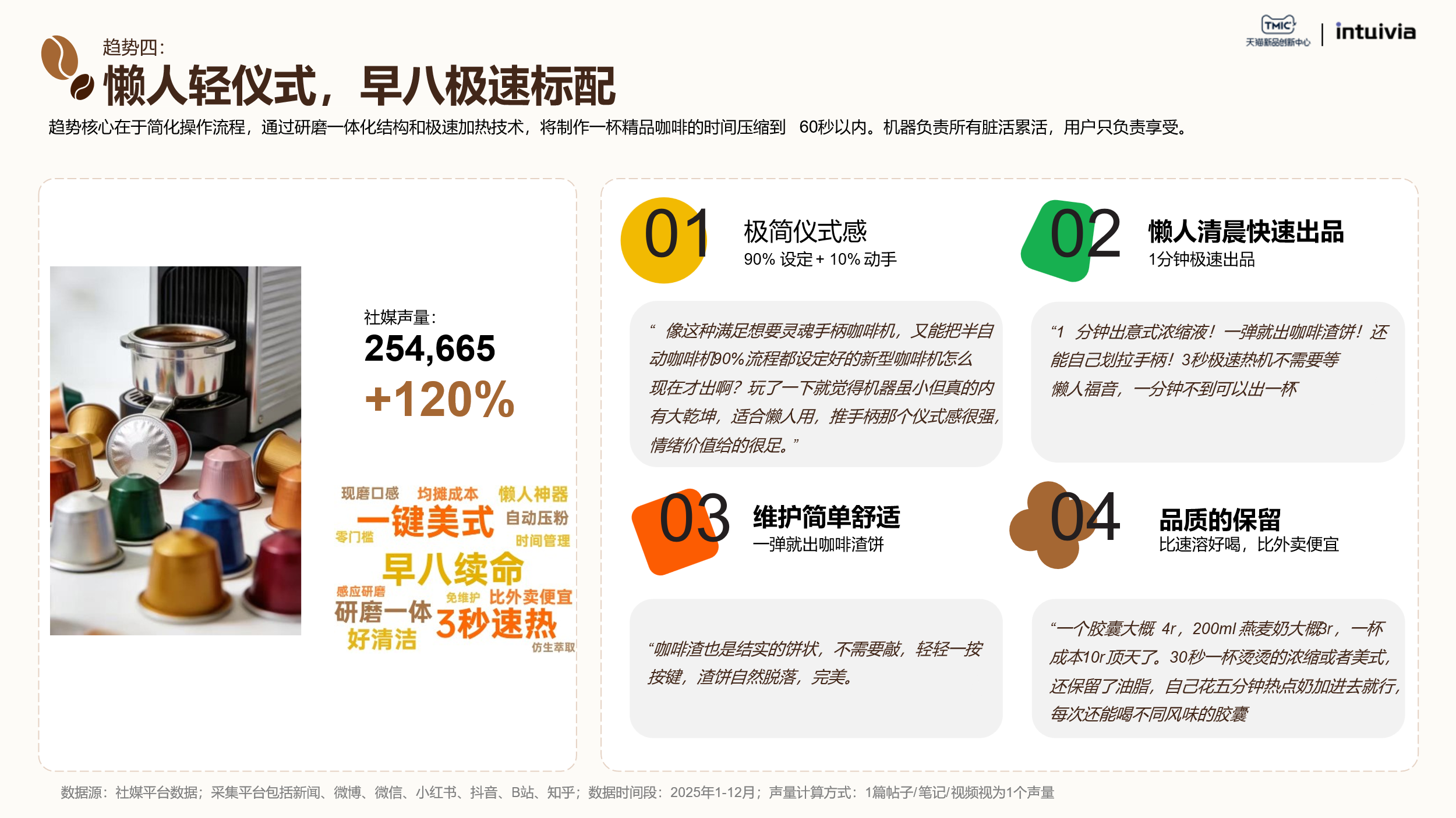 高效型社交尝鲜新青年是国产创新品牌的主力军。他们的决策逻辑是性价比优先,其次是颜值和易用性。咖啡不仅是日常提神饮品,更是社交货币。他们偏好制冰、冷奶泡、双豆仓等功能模块,追求的是日常生活节奏中的小确幸和生活里的一点甜。