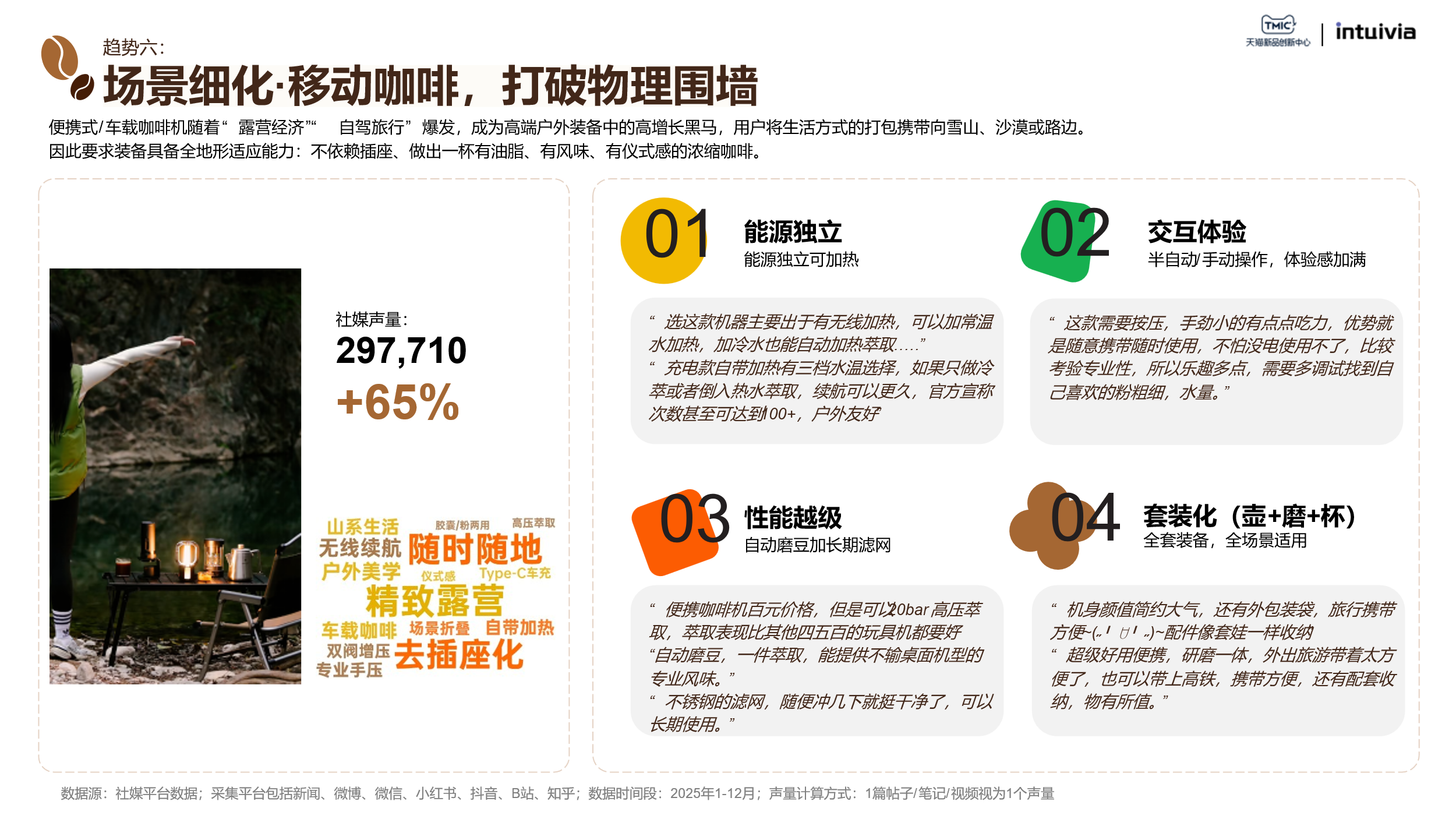 便携咖啡机随露营、自驾兴起,20Bar高压、自动磨豆、续航百杯,让咖啡无处不在。