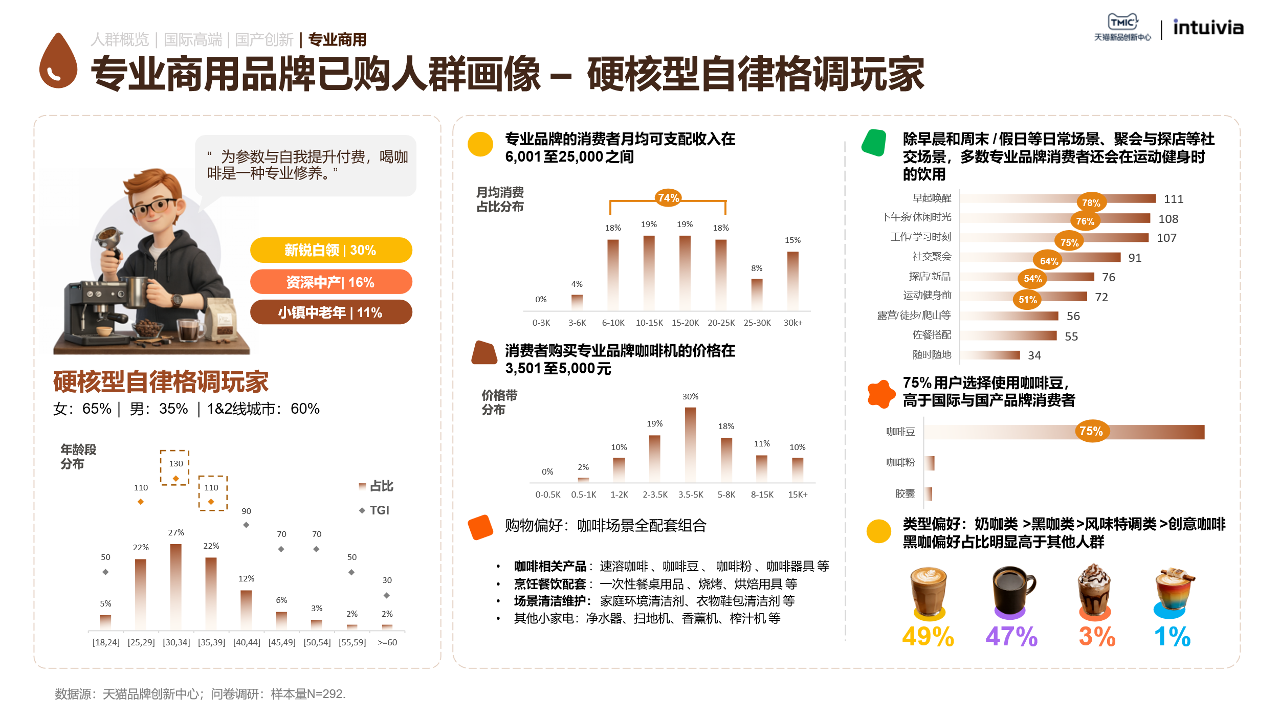 硬核型自律格调玩家是专业商用品牌的核心购买人群。他们的决策逻辑围绕配置性能和系统完整度展开。咖啡是自律生活方式的一部分,常在运动健身时饮用。他们偏好制冰、多饮品、电子手冲等功能,追求的是对咖啡风味的精准掌控和完整的家庭咖啡系统搭建。