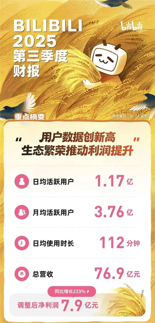 摘要:近日,哔哩哔哩(NASDAQ:BILI,HKEX:9626)发布2025年第三季度未经审计财报。报告显示,公司本季度总营收达76.9亿元人民币,同比增长5%;调整后净利润7.9亿元,同比大幅提升233%,毛利率连续十三个季度环比攀升,B站......