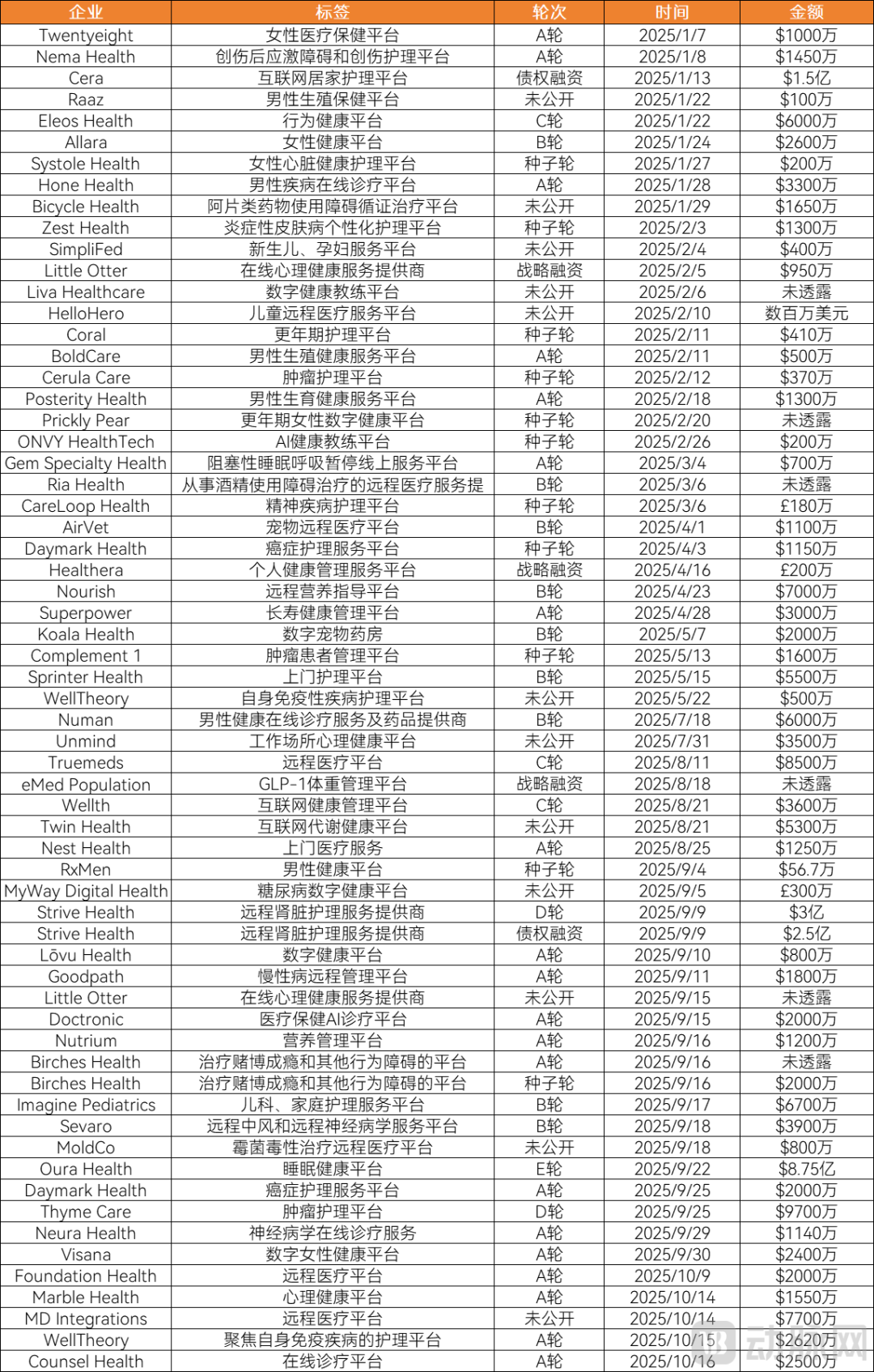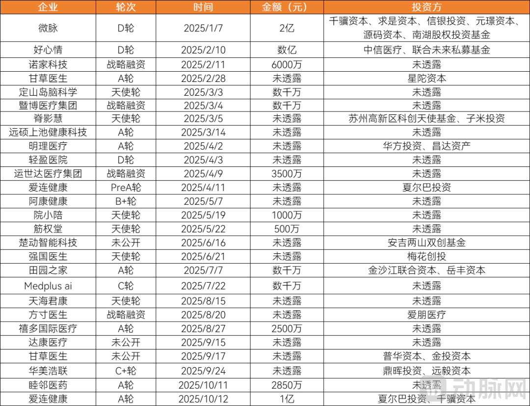 民营医疗机构领域,国内市场的5笔融资分散在口腔、中医、辅助生殖、心理健康及养老五个细分赛道。海外民营医疗机构共发生25笔融资,以诊所为主,专科化趋势显著,从女性健康、骨科、康复,到静脉注射、儿科、眼科、妇科,乃至阿尔茨海默症照护,均有企业获得融资。