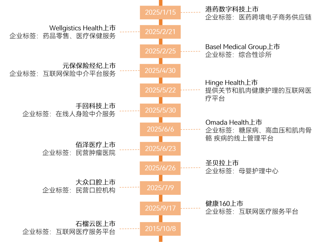 2025年,医疗服务IPO板块呈现复苏态势。截至2025年10月,国内共有8家企业成功上市,覆盖了互联网医疗、保险科技、民营肿瘤医院、跨境医药、民营口腔及母婴护理中心方向。海外有4家医疗服务企业登陆资本市场,包括2家互联网医疗公司。与2024年相比,海内外新上市企业数量均有增加,向市场释放了行业整体回暖的积极信号。