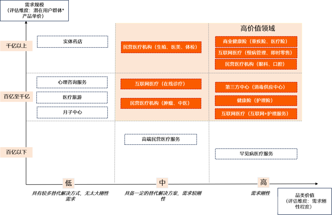 在此情况下,从庞杂的细分领域中识别出具备可观市场规模与需求刚性的高价值领域,对投资者、创业者有重要意义。动脉智库尝试从“市场规模”与“需求刚性”两个角度出发,对医疗服务细分领域进行价值判断。研究发现,互联网医疗板块中的医药即时零售与“互联网+护理服务”,民营医疗板块中的眼科、生殖、体检、口腔,以及第三方医疗服务板块中的消毒供应中心,在2025年展现出高价值领域的典型特征。