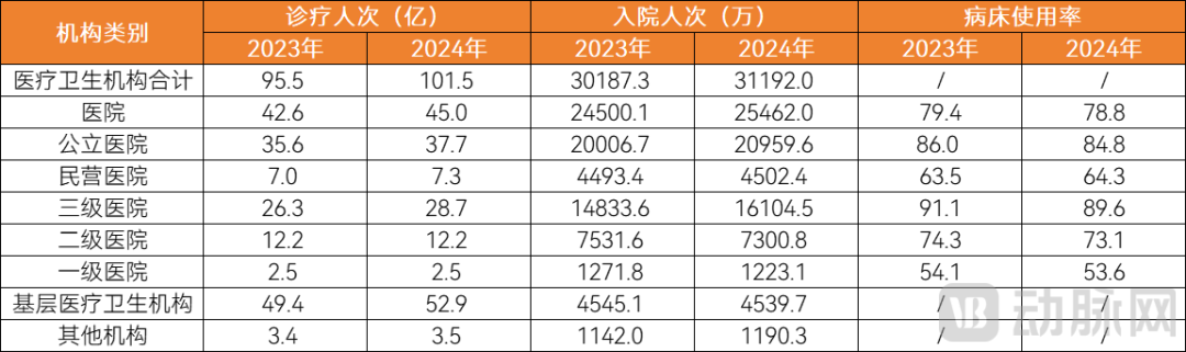 医疗服务供给端呈现出总量增长、结构优化、费用控制的积极态势。2024年,全国医疗卫生机构总诊疗人次101.5亿,比上年增加6.0亿人次;入院人次31192.0万,比上年增加1004.7万人次。分级诊疗成效显著,一、二级医院和基层医疗卫生机构诊疗人次为67.6亿人次,占总诊疗人次的66.6%。其中,乡镇卫生院、社区卫生服务中心(站)、村卫生室诊疗人次39.8亿,比上年增加2.3亿人次。