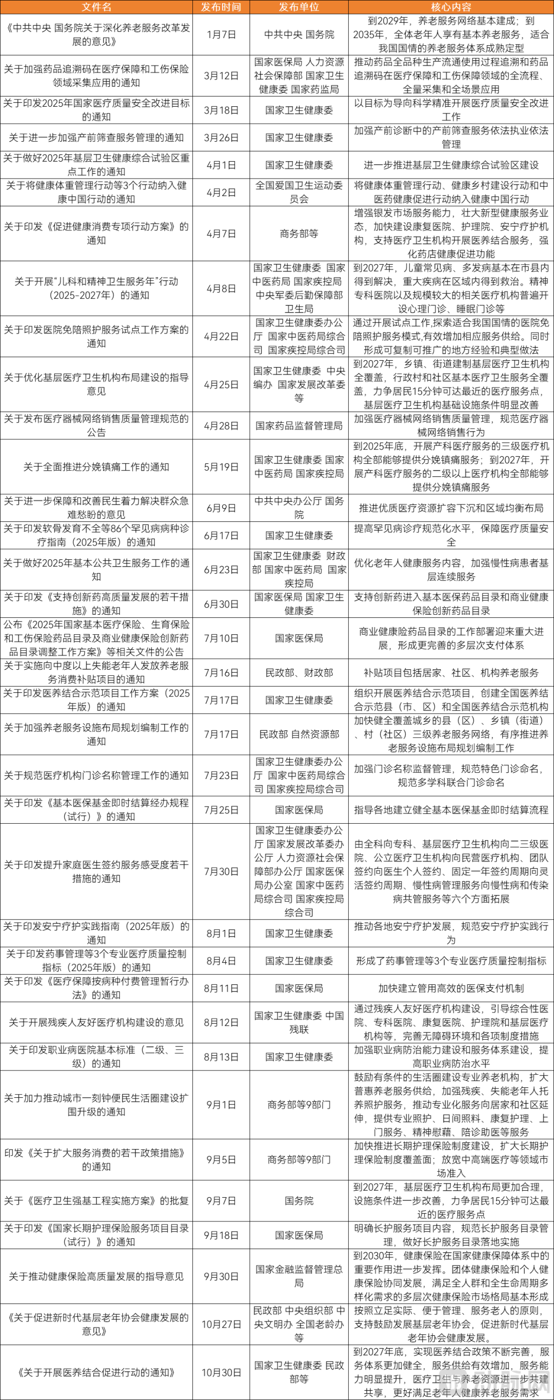 2025年是“十四五”规划的收官之年,国家围绕医疗服务密集落子。动脉智库对2025年行业相关政策进行梳理,发现老年人健康服务、基层医疗服务能力强化、健康管理、药价治理、支付体系完善是政策关注的重点。