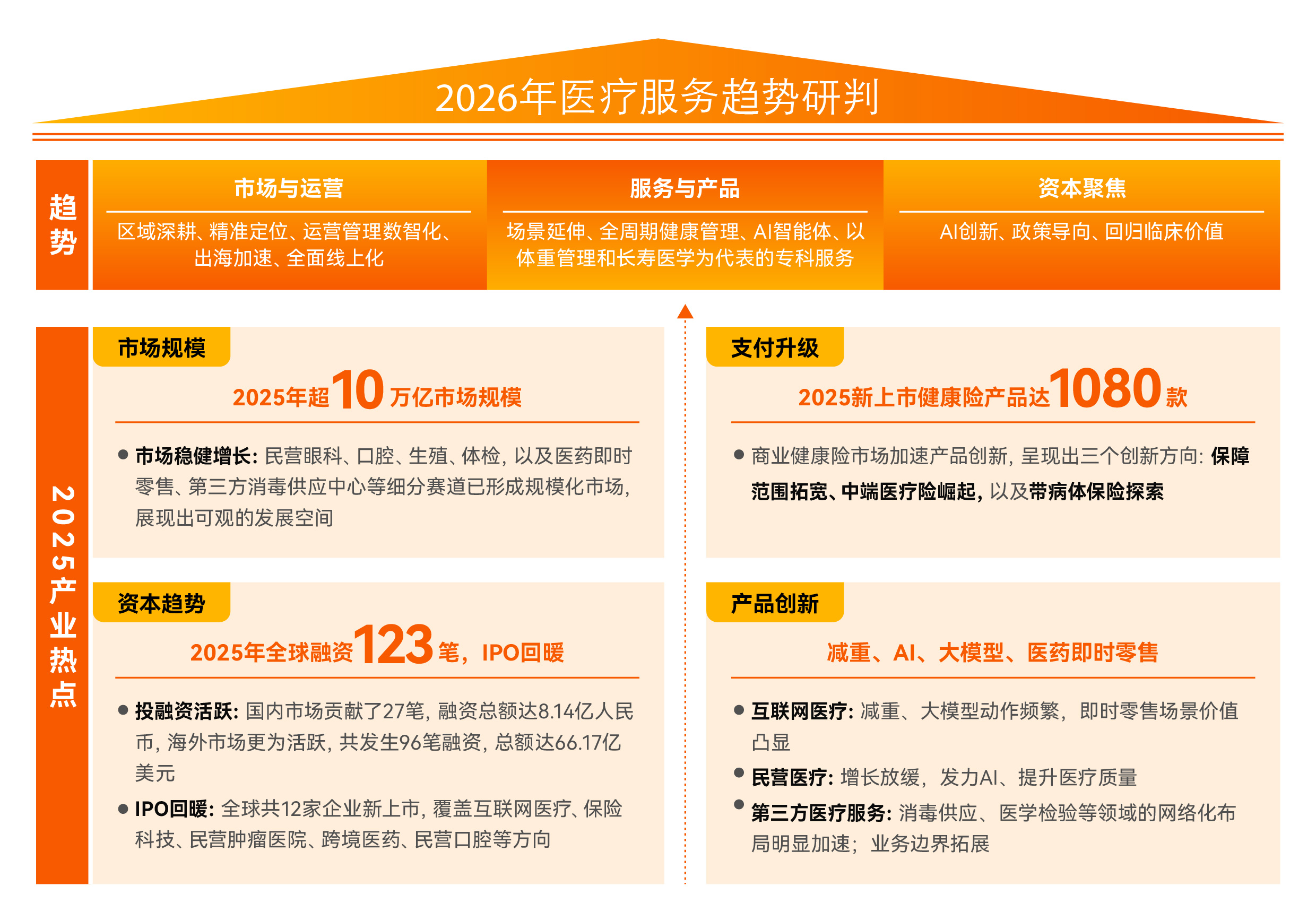 中国医疗服务行业正站在触底回升与转型升级的关键节点,逐渐告别粗放增长模式,迈入以质量、效率与价值为核心的发展阶段。2025年,政策集中于老年健康、基层能力强化及支付体系优化;资本市场虽总体趋缓,但资金在理性涌向AI创新与政策导向明确的细分领域;企业则落地探索AI大模型,并在体重管理、医药即时零售等赛道展开密集布局。